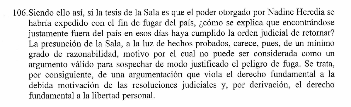 Además el TC, añade que, si la tesis de la Sala del Poder Judicial era que la Carta Poder fue otorgado con el fin de fugar del país, ¿cómo se explica que encontrándose fuera del país (Nadine Heredia) en esos días haya cumplido la orden judicial de retornar?